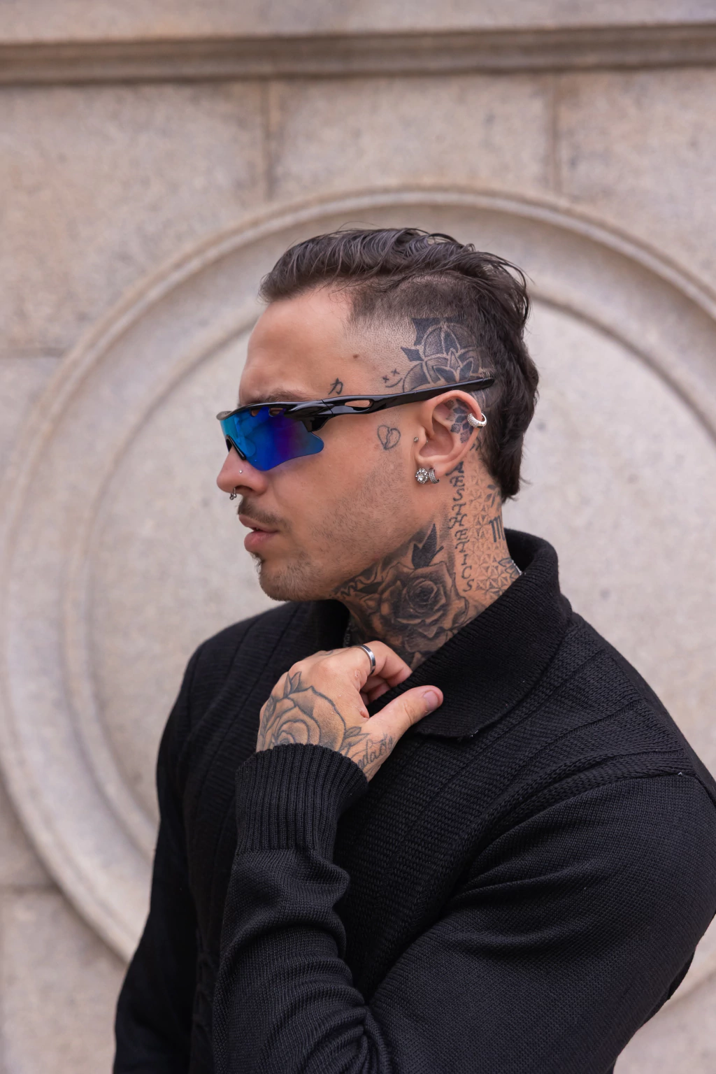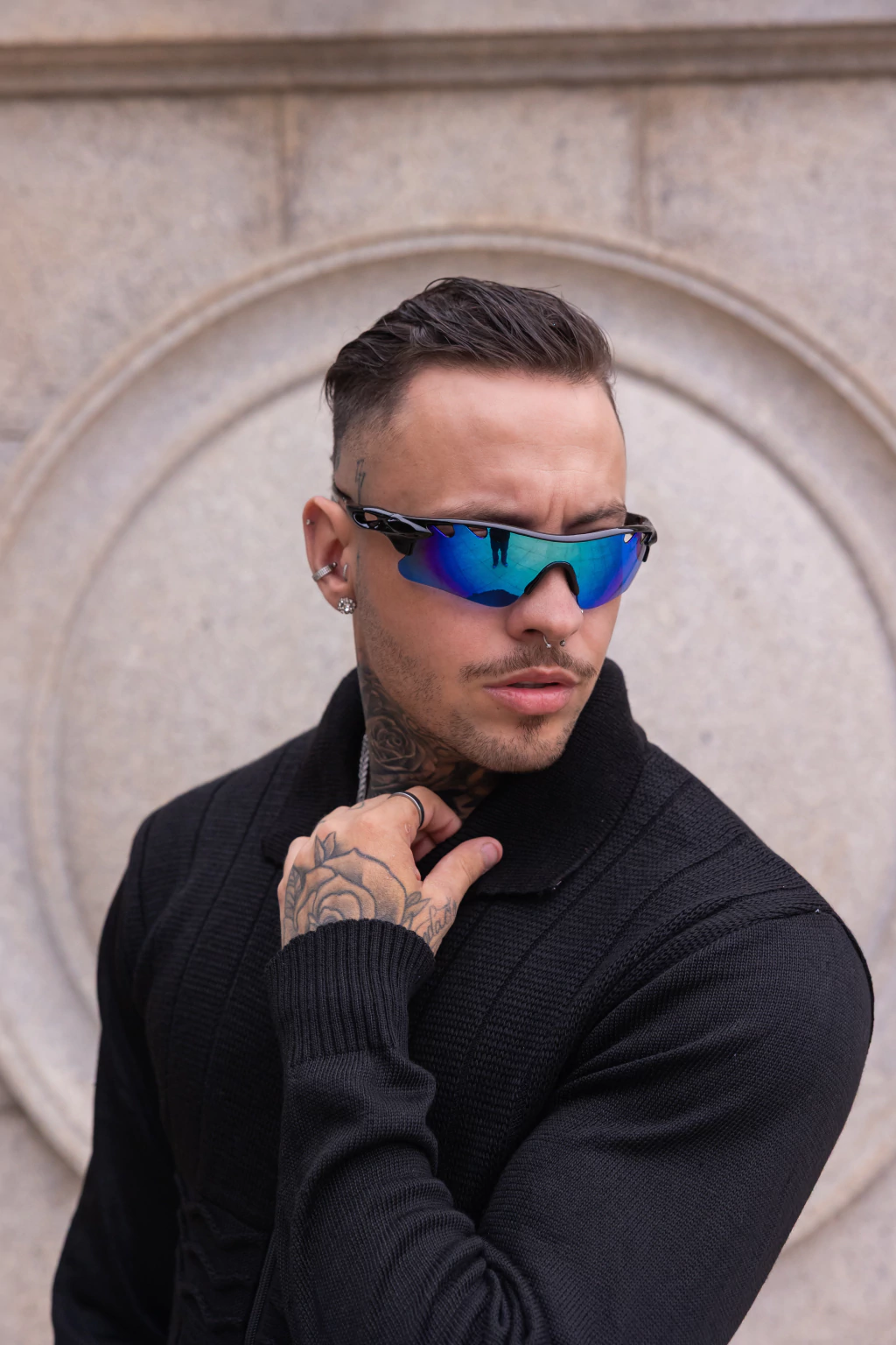 O Óculos de Sol Esportivo Clássico oferece um visual moderno com foco em desempenho e estilo. Sua armação preta aerodinâmica proporciona firmeza e leveza, enquanto as lentes espelhadas em azul degradê garantem impacto visual e proteção.