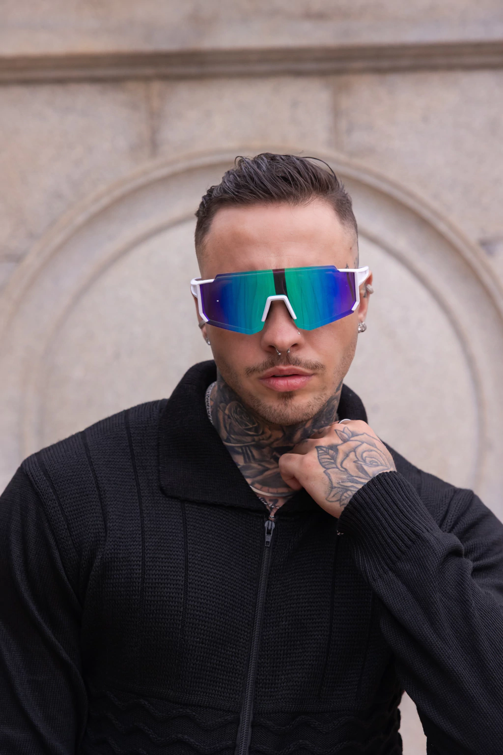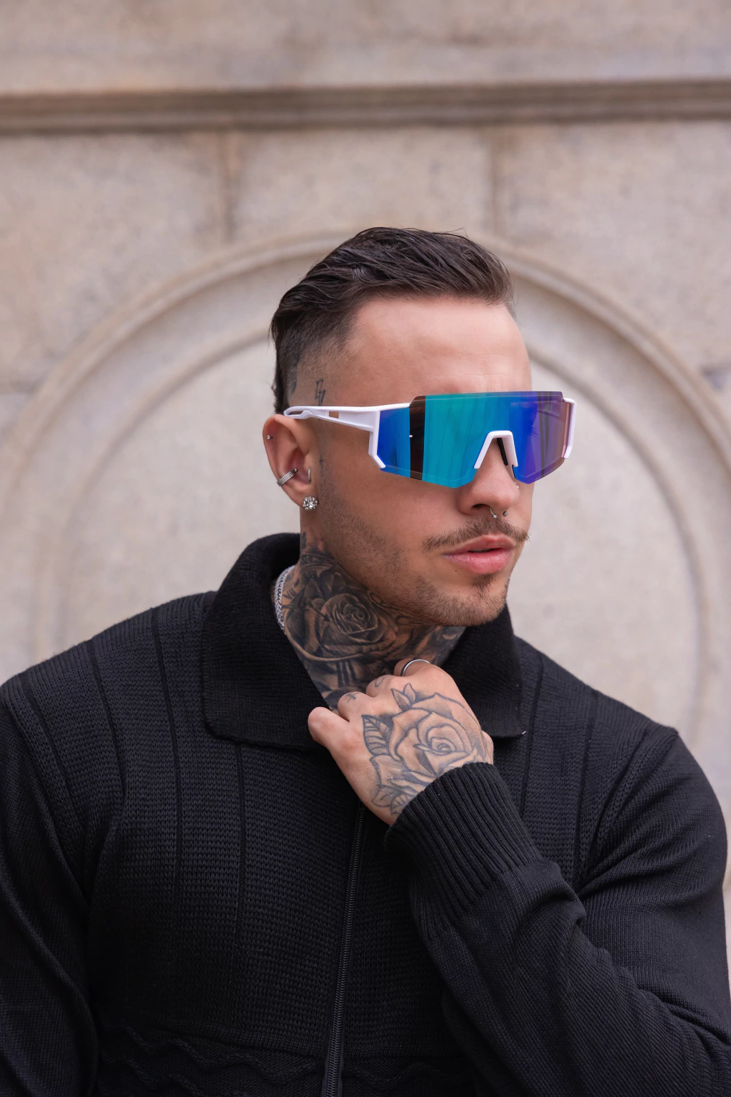 O Óculos de Sol Máscara Clean é a escolha perfeita para quem busca um visual esportivo com toque moderno. Sua armação branca robusta traz personalidade, enquanto as lentes espelhadas em azul/roxado garantem estilo e proteção.