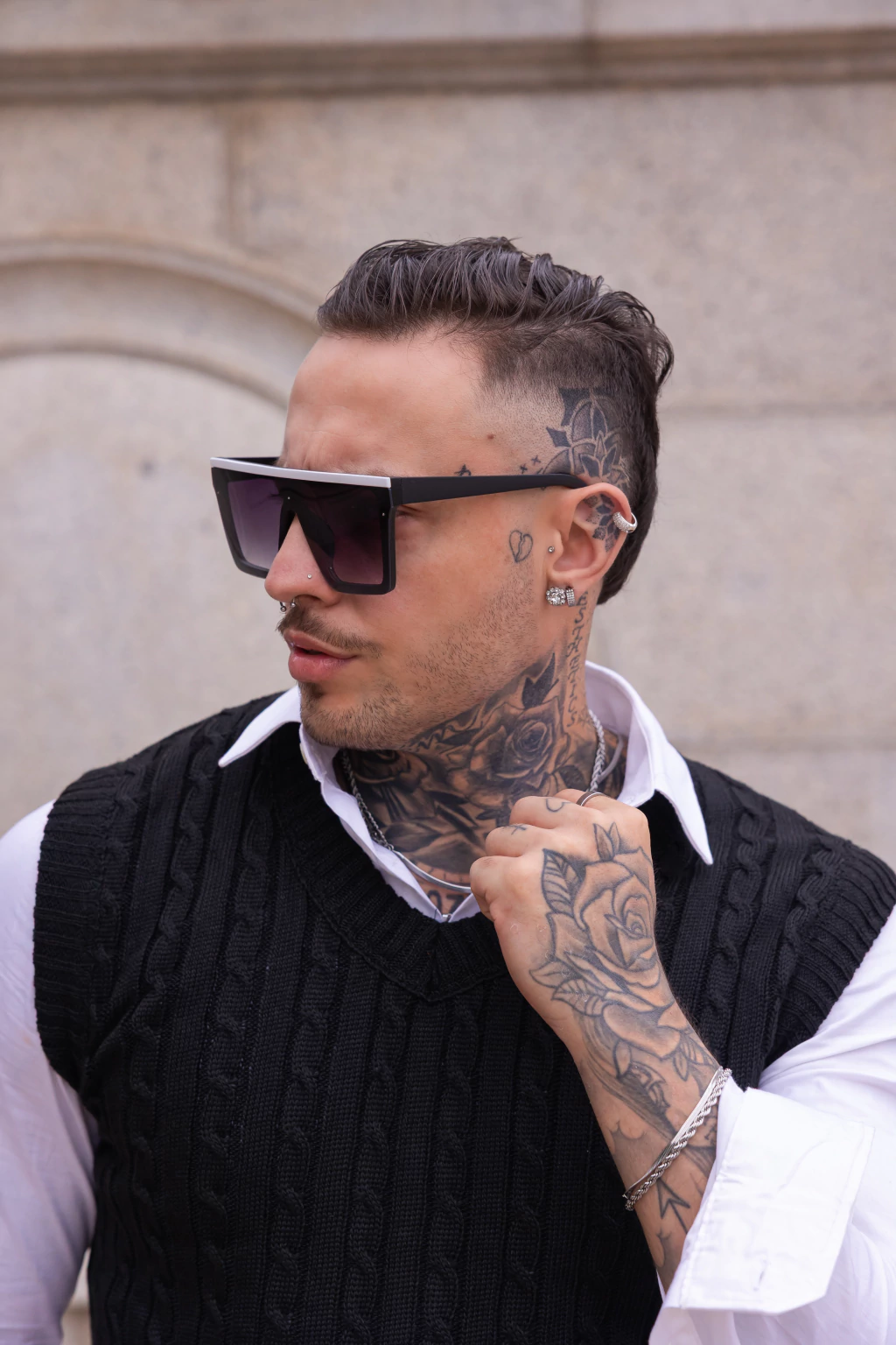 O Óculos Oversized Futurista traz um estilo impactante para quem busca exclusividade e modernidade. Sua armação quadrada oversized em preto é complementada por uma barra metálica prateada superior, que adiciona sofisticação ao design.