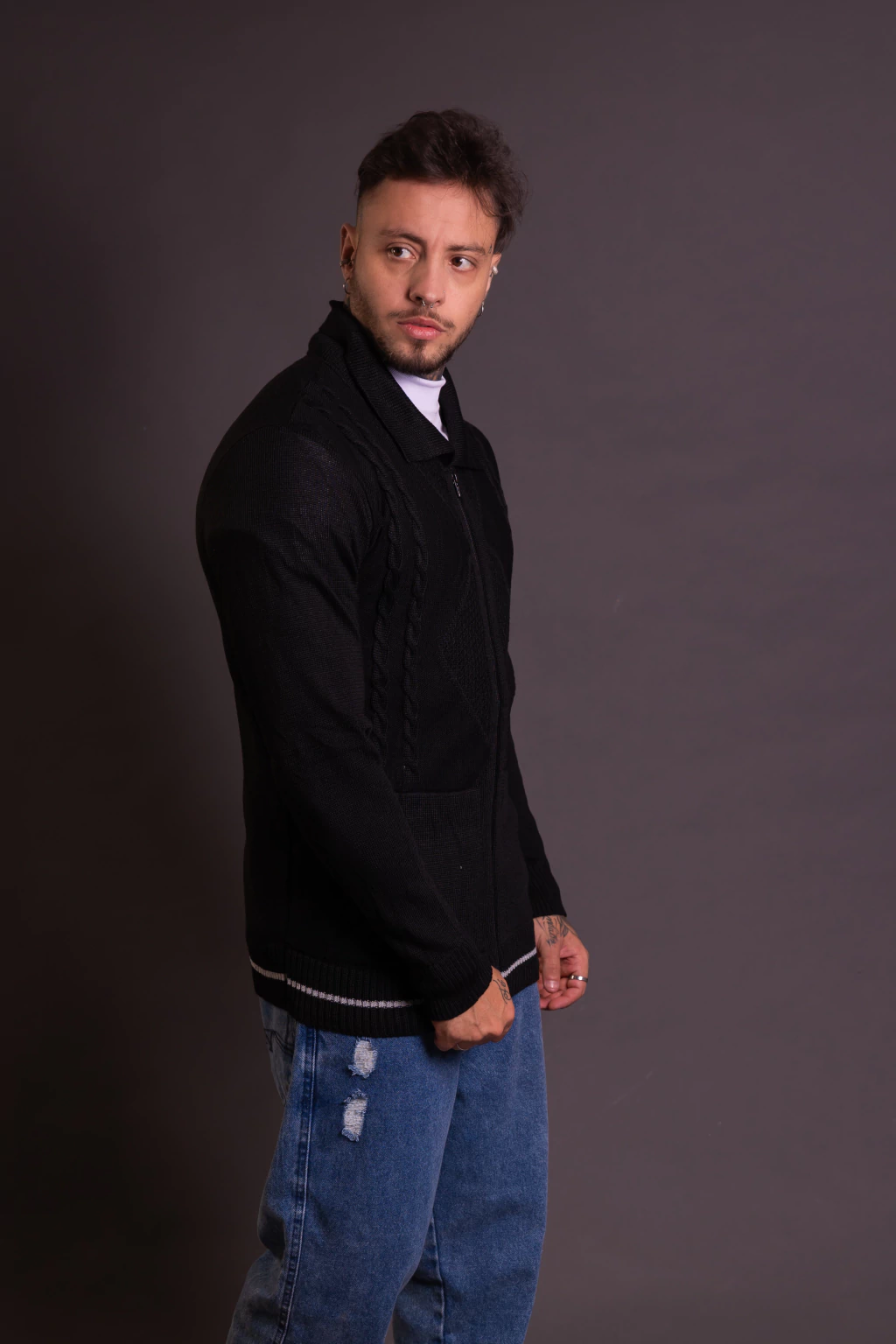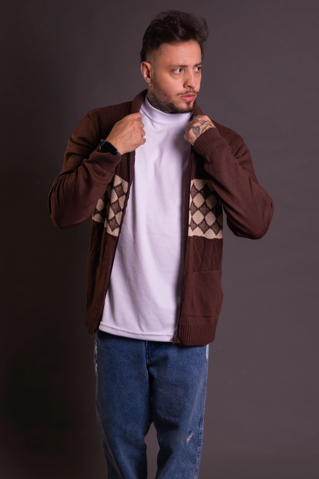 O Suéter Tricot Marrom Geométrico com Zíper Roma Saints combina conforto, estilo e versatilidade para os dias mais frios. Confeccionado em lã tricot de alta qualidade, possui modelagem moderna com detalhes em trança e fechamento em zíper frontal, garantindo praticidade no uso. Ideal para compor looks casuais ou mais sofisticados, proporcionando elegância e aconchego em qualquer ocasião.